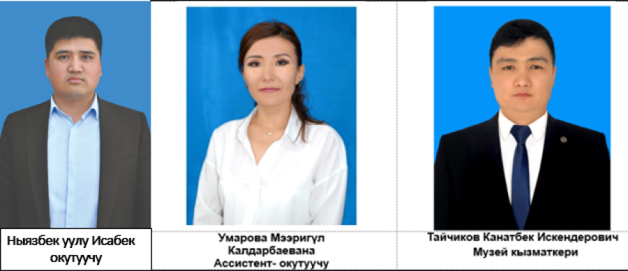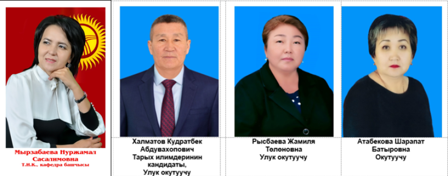 В настоящее время для осуществления специальной подготовки по данному направлению на кафедре имеются необходимое число преподавателей с соответствующим базовым образованием и учеными степенями. Преподавательский состав кафедры составляет 11 человек, качественный показатель – 55,5 %. Из них – 5 кандидат наук, профессора -2, (доцентов -4,), старших преподавателей-2, преподавателей -2, ассистент-преподаватель -1, лаборант-1 я и сотрудник музея-1 (№21/1 от 23.01.2023 года). Отличников образования КР - 7. Состав и квалификация преподавателей соответствуют требованиям образовательного процесса для достижения результатов обучения.